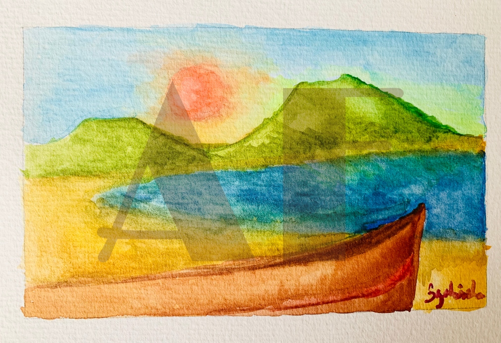 Une scène paisible et pittoresque se déploie devant nos yeux, mettant en scène une barque abandonnée près d’un lac bleu profond, entouré de majestueuses montagnes recouvertes de sapins. La barque, vieillie par le temps, repose silencieusement sur la rive du lac, évoquant des souvenirs de voyages passés et d’aventures lointaines. Cette peinture aquarelle évoque des sentiments de nostalgie, de solitude et d’émerveillement. Elle invite le spectateur à contempler la grandeur des montagnes et à ressentir la paix et la beauté de ce coin isolé de la nature.