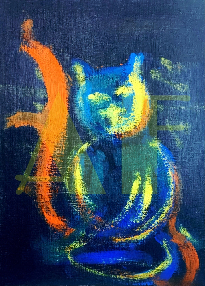Un chat silencieux est assis avec une grâce innée près de la porte d’entrée, ses yeux brillants reflétant une attente empreinte de tendresse. Le pelage du félin, caressé par les pinceaux, déploie une palette de couleurs riches et profondes, du jaune velouté aux nuances d’orange et de bleu. Ainsi, la peinture, avec sa texture riche et ses nuances subtiles, capture l’essence même de l’attente empreinte d’un amour inconditionnel, où chaque seconde étire le fil invisible de l’attachement entre l’animal et son maître.