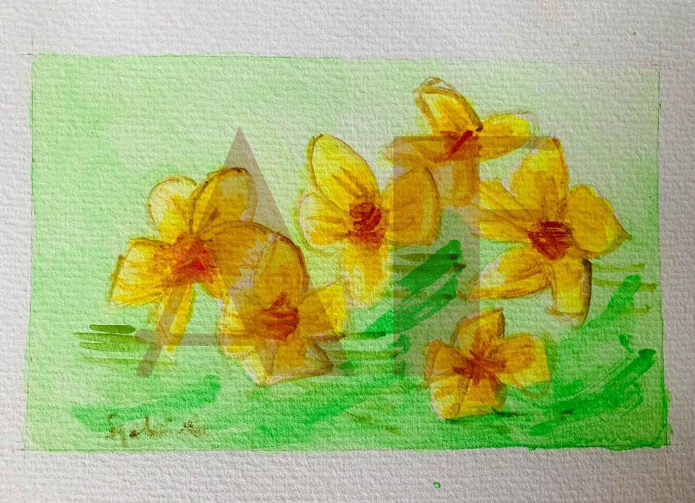 Un champ de fleurs boutons d’or s’épanouit dans une symphonie de jaunes éclatants, d’ocre et de verts apaisants. Les pigments, délicatement dilués et déposés, créent une scène vibrante et lumineuse, capturant l’essence même d’un paysage estival baigné de soleil. Les coups de pinceau sont libres et souples. Ainsi, cette peinture aquarelle est une invitation à la contemplation, à s’immerger dans la douceur et la poésie d’un jour ensoleillé, où chaque fleur raconte une histoire de lumière et de vie.