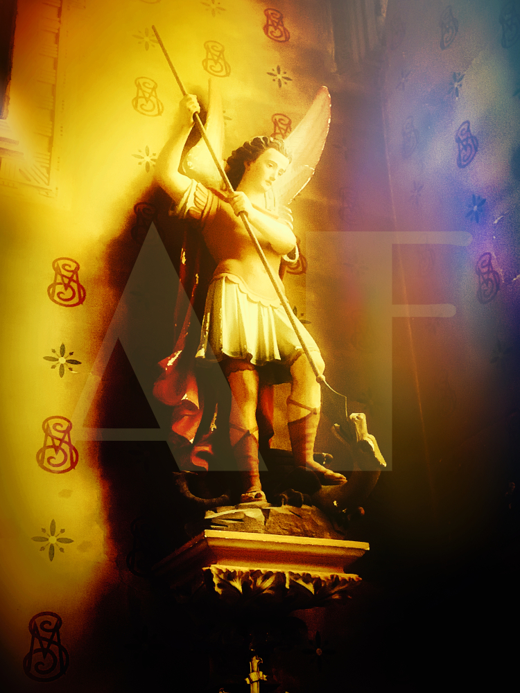 L’archange, avec ses ailes majestueuses déployées, semble descendre du ciel, son visage exprimant une détermination sereine. Sa lance, tenue fermement dans ses mains, semble vouloir transpercer un ennemi invisible à ses pieds, symbolisant la victoire du bien sur le mal. Les détails minutieux du bois révèlent les plumes des ailes de l’archange, ajoutant une texture riche et réaliste à l’œuvre. La photographie capture la lumière qui se reflète sur la surface polie du bois qui accentue les contours et les ombres, donnant vie à cette scène mythique et intemporelle.