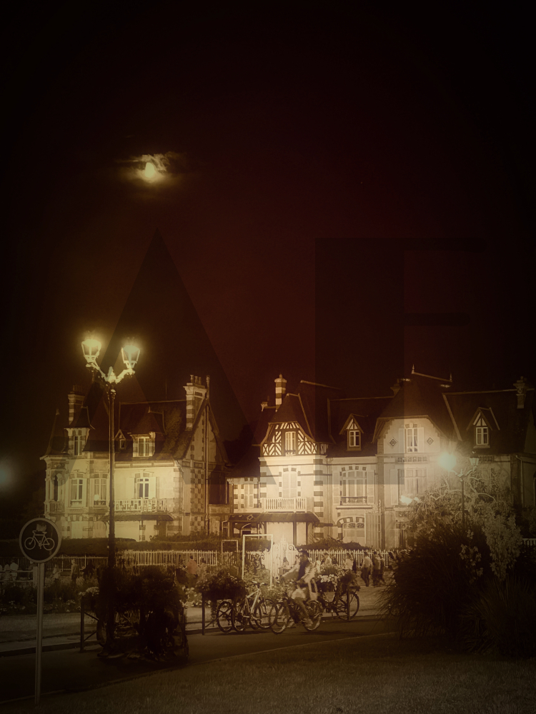Une nuit d’été douce et étoilée, avec une légère brise marine soufflant doucement depuis la plage. Le Grand Hôtel de Cabourg se dresse majestueusement sous un ciel constellé, ses façades élégamment illuminées par une lumière chaude et accueillante. Les fenêtres du bâtiment historique scintillent comme des joyaux, projetant des lueurs dorées sur le parterre de fleurs soigneusement entretenu qui entoure l’hôtel. Au loin, le bruit apaisant des vagues caressant le rivage se mêle aux rires et aux murmures des invités profitant de la fraîcheur nocturne sur les terrasses. Le Grand Hôtel de Cabourg, baigné dans cette ambiance de nuit d’été, respire le charme d’une époque révolue. C’est un tableau vivant où l’histoire et la modernité se rencontrent dans un écrin de lumière et de sérénité.