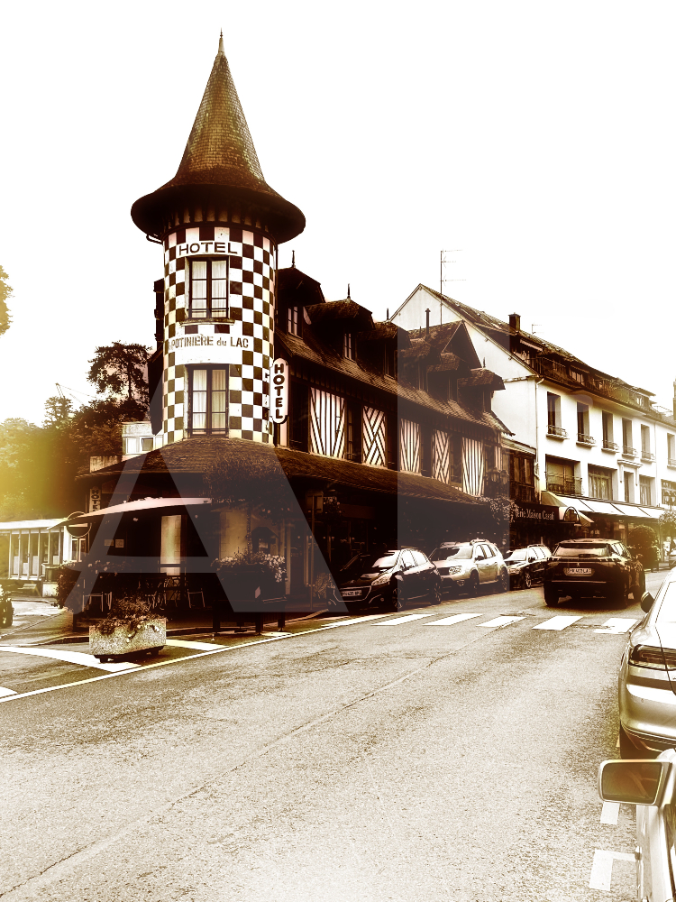 Une rue de Bagnoles-de-l’Orne ; au premier plan, une élégante tourelle se dresse fièrement, ornée de motifs à damier. Ses carreaux noirs et blancs créent un contraste frappant, rappelant un échiquier géant. Le reste de l’hôtel, en arrière-plan, dévoile une architecture charmante et classique, avec des fenêtres bordées de volets colorés. La lumière douce de l’après-midi enveloppe la scène, ajoutant une touche de chaleur et de nostalgie.